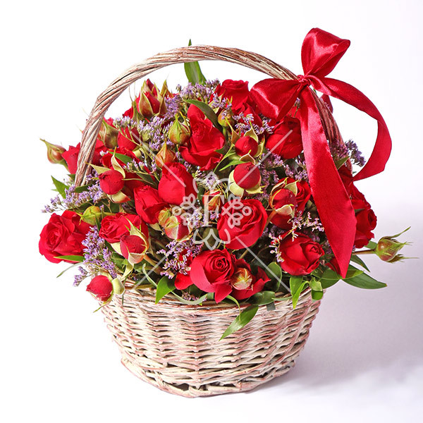 роза красная кустовая 11 шт.,  лимониум, декоративная зелень, оазис, корзина малая, лента